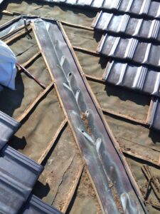 現場調査を行なったところ、本谷は穴だらけで、5寸勾配にもかかわらず雪止めが設置されておらず、雨樋も一部破損している状態でした。